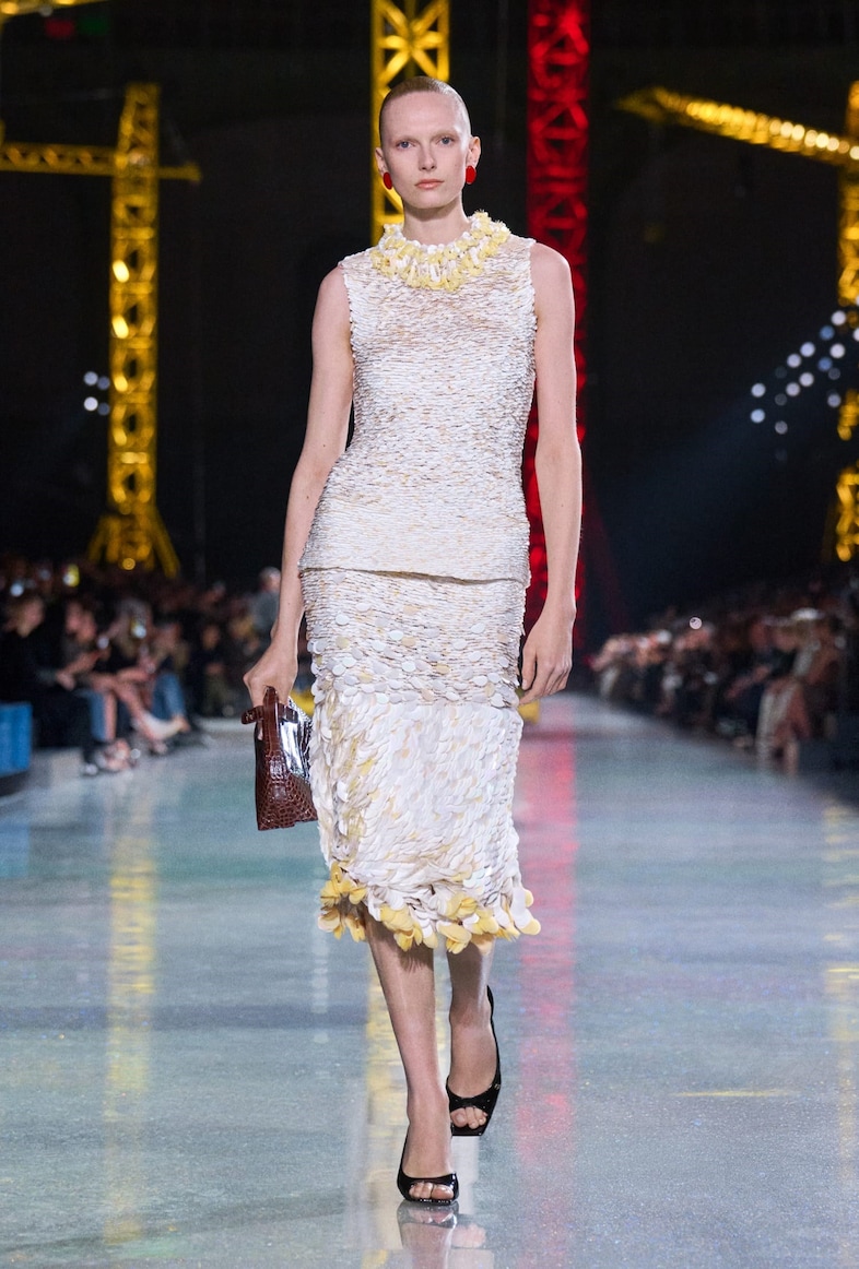 Blazy has taken us to space, to the New York subway, to a mushroom patch, and now to a building site. Towering true-to-size cranes lined the runway, glowing in bright red, yellow, green and blue. It might have been a less glamorous set-up than we’re used to from Chanel, but it was impressive all the same. The runway itself was lit up to look like a brick road – but not a yellow one, a faint rainbow brick road instead. The construction site could be seen as symbolic for Blazy, who laid his foundations last season, and continues to build on his vision for Chanel with every collection.